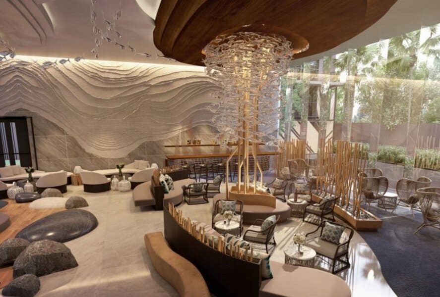 The luxurious lobby of the five-star hotel is decorated in the style of an imaginary underwater world. The lobby has a separate living area and a reading area with a bar where you can order drinks.