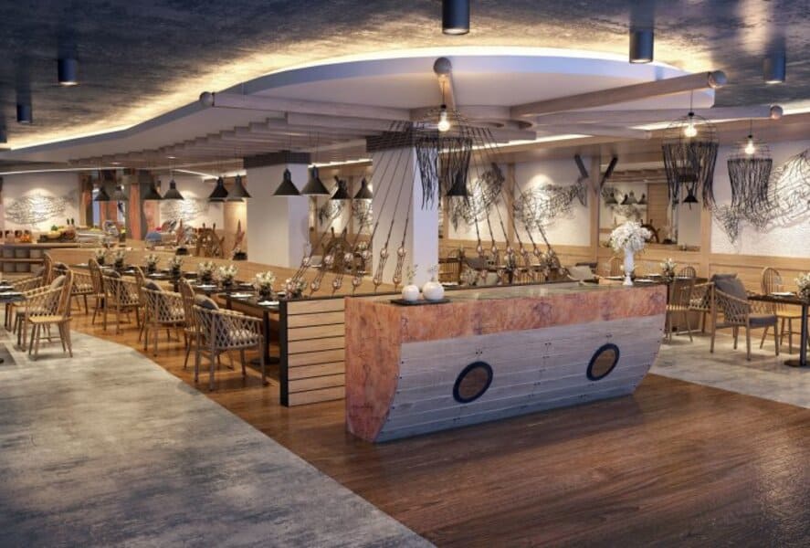 The restaurant’s decor recreates the atmosphere of a fishing boat sailing in the middle of a calm sea.