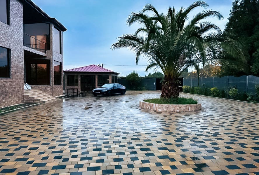 The yard is tiled, which gives the plot a well-groomed appearance and simplifies its maintenance.
