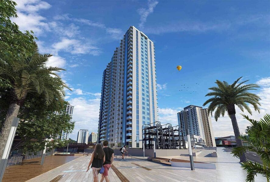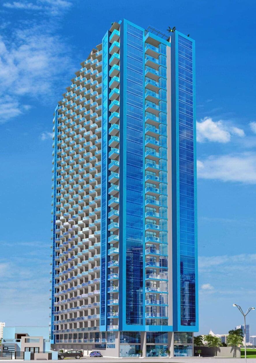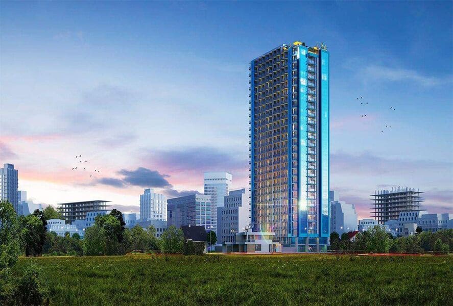 The New Boulevard residential complex is a modern complex that includes a 27-story tower with panoramic windows and a stylish facade.