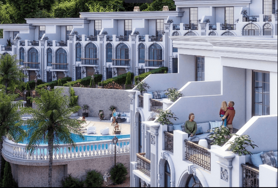 The new building is designed in European architectural style. Pilasters, open French balconies and arched windows add sophistication to the architecture of the houses.