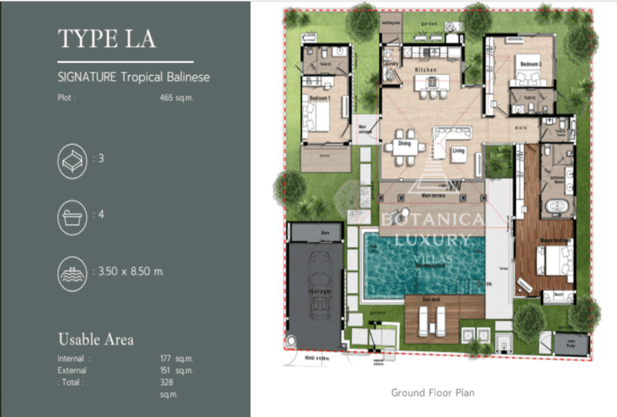 You can buy property in Botanica Lakeside II, choosing a villa ranging from 329 to 590 m² with 3 or 4 bedrooms and a swimming pool. Land plots at Botanica Lakeside II are large, ranging in size from 465 to 897 m².