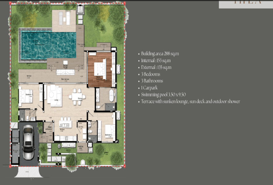 Villas are an excellent example of how sophisticated design is combined with natural motifs and functionality. Spacious bedrooms with panoramic windows overlook the private pool or private garden. The modern kitchen is equipped with everything you need. The patio and large seating area near the pool are suitable for sunbathing and parties with friends. Everything is designed to be in perfect harmony with nature, with each villa surrounded by a stylish tropical garden.