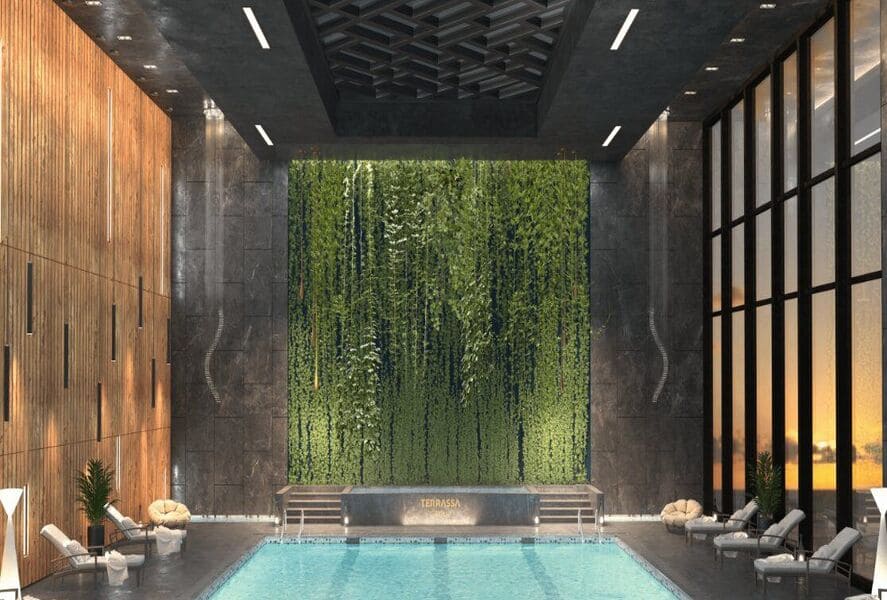 Новостройка относится к недвижимости класса премиум. На ее территории есть собственная инфраструктура в виде крытого плавательного бассейна, кафе и ресторана.