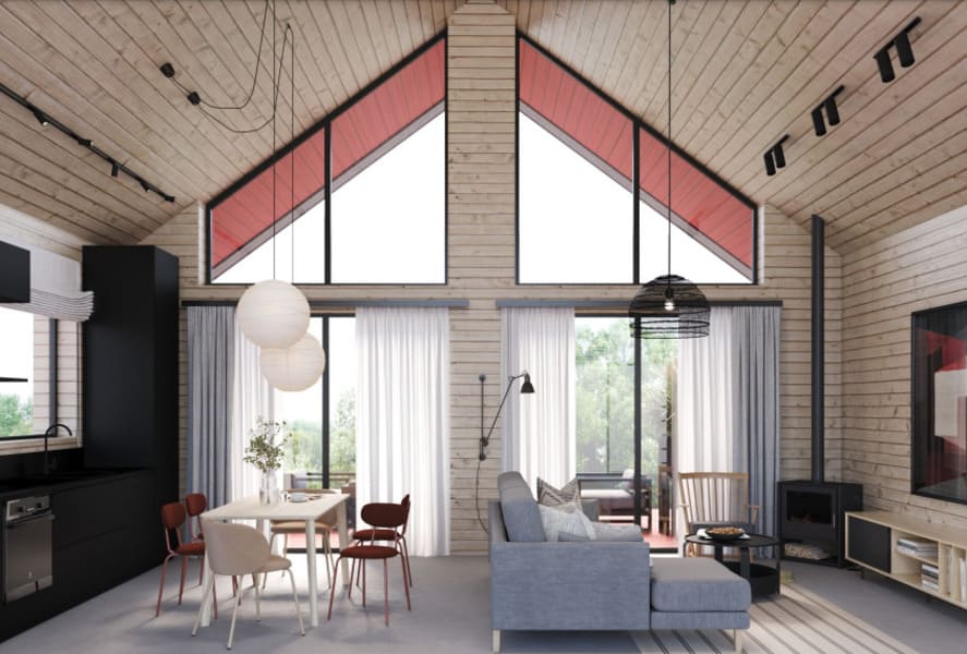 Открытая планировка и большие панорамные окна приглашают естественный свет внутрь, создавая светлые и уютные интерьеры. Внутренне е пространство быть украшено элементами из натурального дерева и камня, что сохраняет единый стиль и создает атмосферу тепла и комфорта .